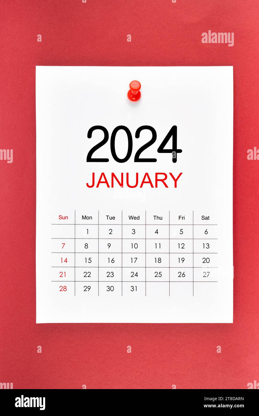January 2024 calendar page with push pin on red background Stock