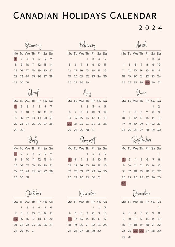 Beige 2024 Canadian Holidays Calendar Federal Holdiays for Office